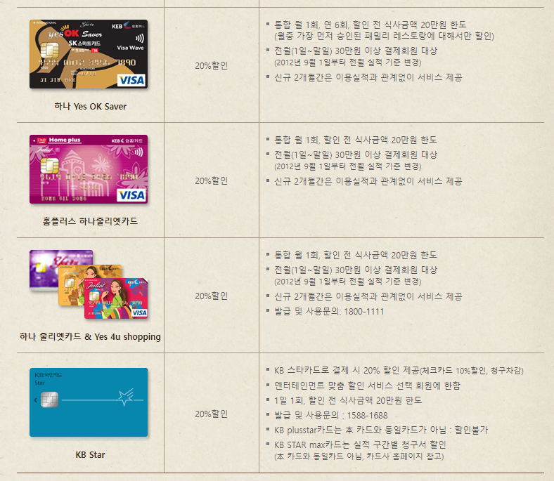20%~25% 할인 카드 - CJ 삼성 iD 카드 The CJ카드 삼성 6 V4카드 신한 Lady카드 삼성 SFC 삼성 S클래스카드 하나 Yes OK Saver 홈플러스 하나줄리엣카드 하나 줄리엣카드 & Yes 4u shopping KB Star