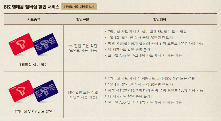 - T멤버십 카드 제시 시 VIP/골드 고객 15% 할인 또는 적립