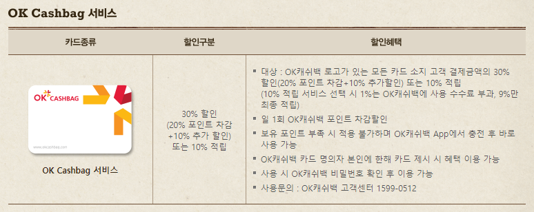 - 대상 : OK캐쉬백 로고가 있는 모든 카드 소지 고객 결제금액의 30% 할인(20% 포인트 차감+10% 추가할인) 또는 10% 적립
