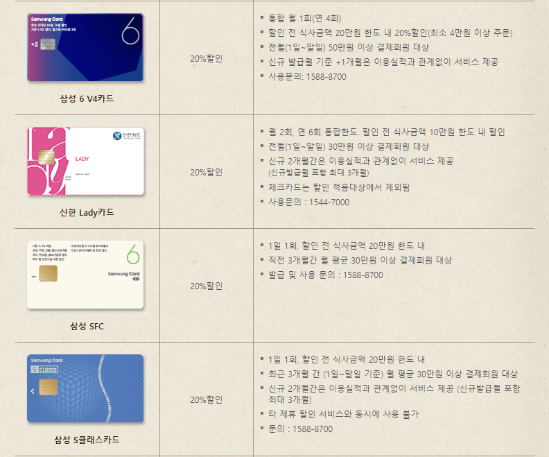 - 1일 1회, 할인 전 식사 금액 20만원 한도 내