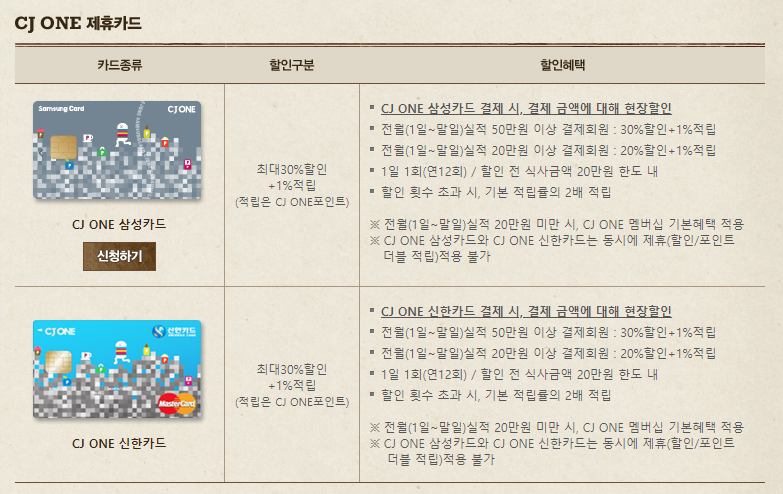 30% 할인 카드 - CJ ONE 삼성카드, CJ ONE 신한카드