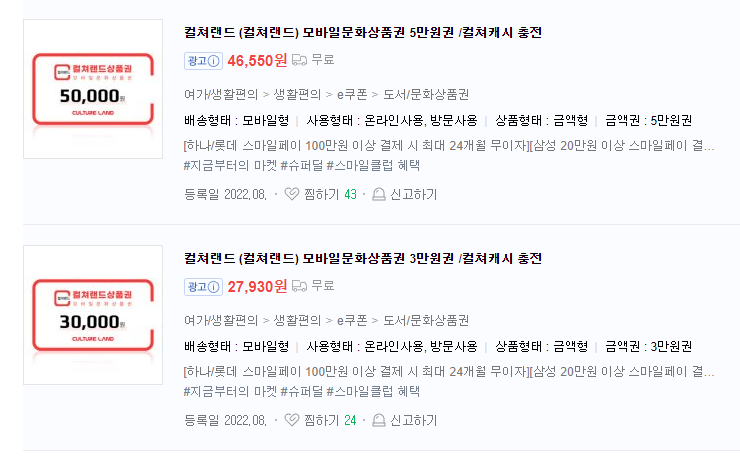 할인방법은 컬쳐랜드문화상품권을 구입하는 것입니다. G마켓이나 네이버쇼핑에서 검색하면 컬쳐랜드문화상품권을 약 6%할인된 가격으로 구매가 가능합니다.
